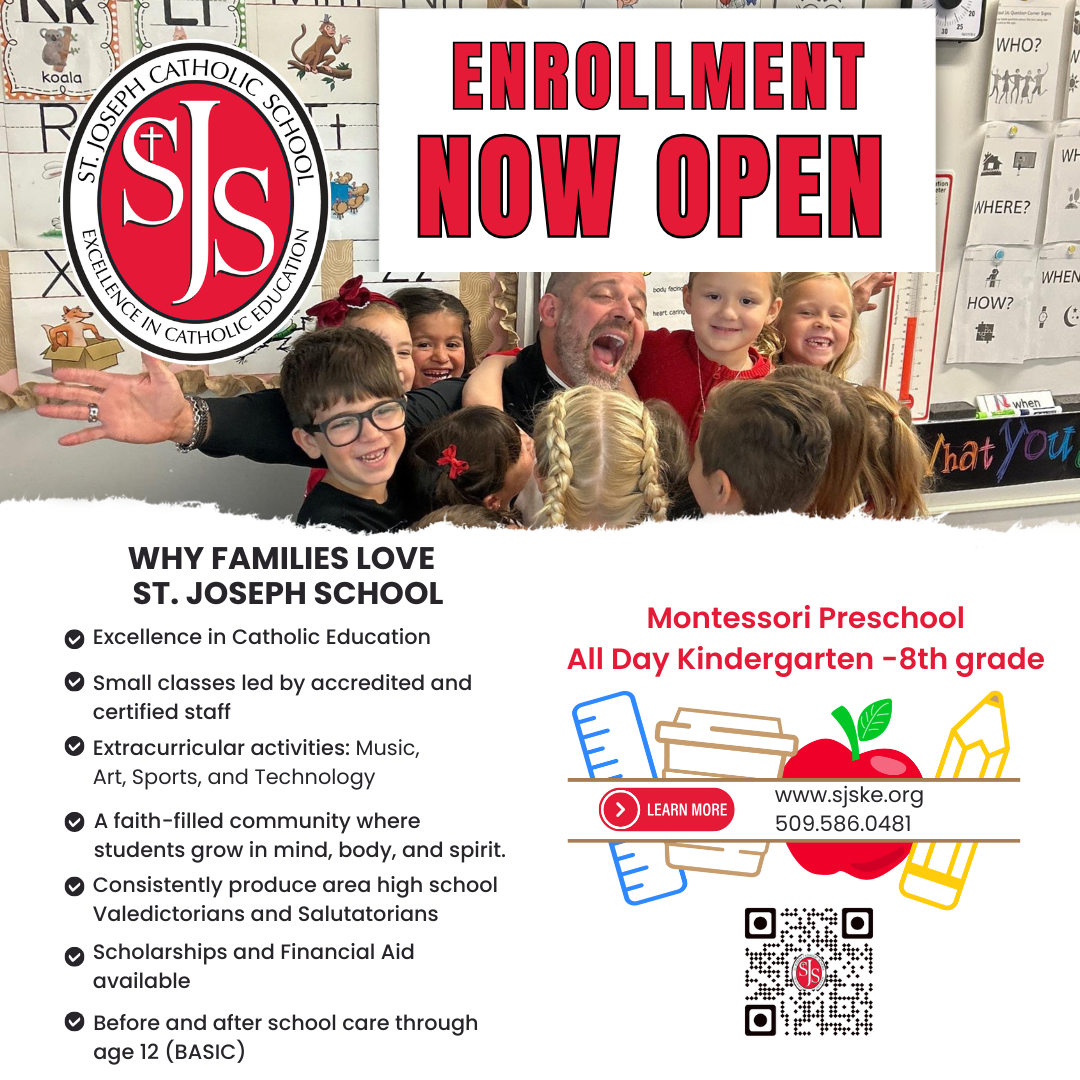 Established in 1964, St. Joseph's Catholic School in Kennewick, Washington, is a dynamic, faith-filled community dedicated to educating the whole child in mind, body, and spirit. Accredited by the Western Catholic Educational Association, the school challenges students from preschool through 8th grade to excel academically while fostering strong moral values rooted in the Catholic tradition. St. Joseph's strives to create a compassionate environment that prepares children for leadership in both the Church and society, emphasizing self-discipline, mutual respect, social justice, and a deep understanding of their role as images of God in the world.
