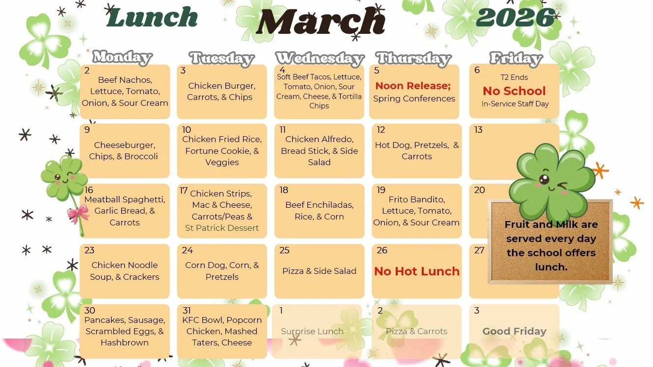 Hot Lunch - Available to all students K-8th grade Monday through Thursday. The menu is also posted on FACTS for your reference and planning.